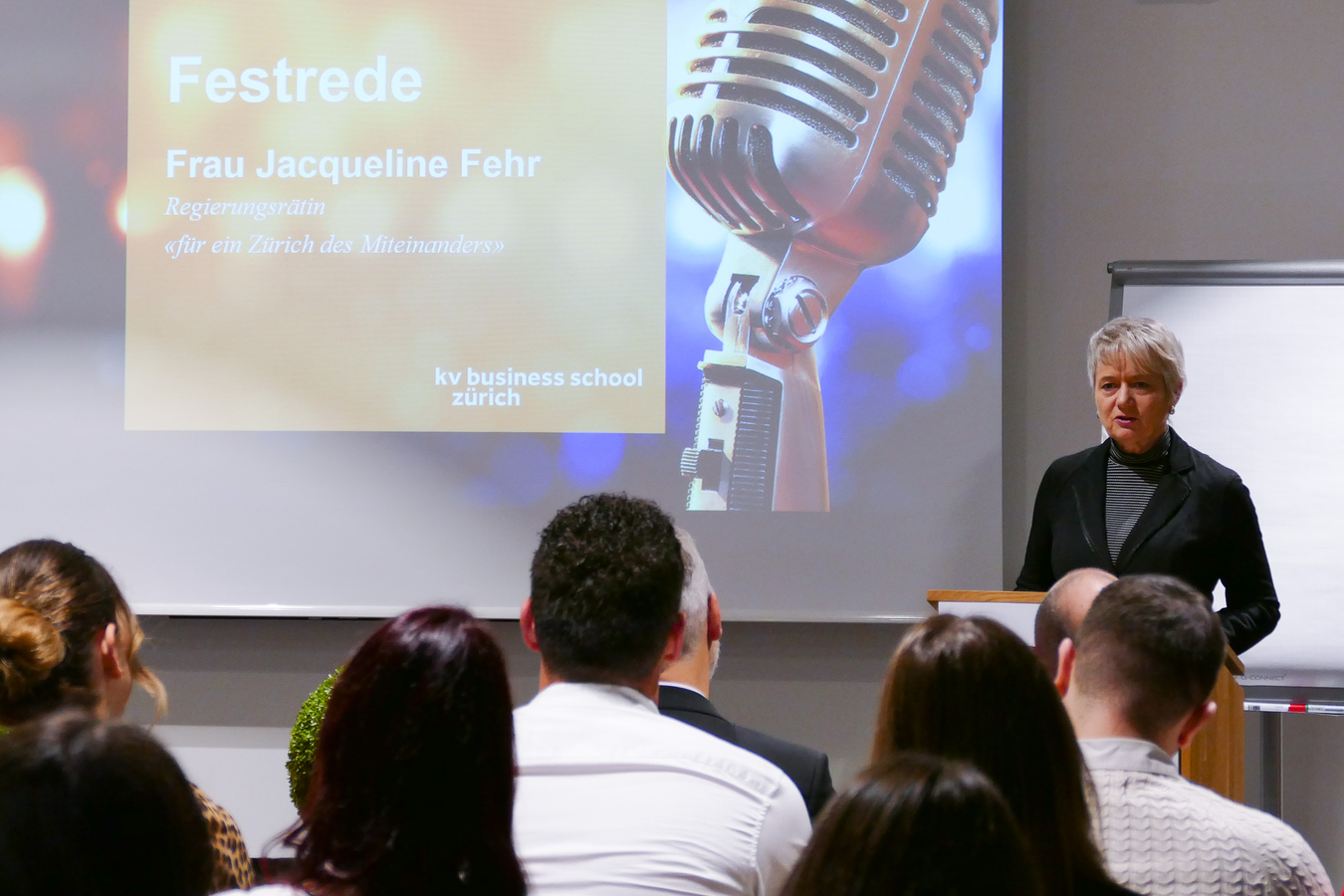Solche feierlichen Momente wie heute seien nur möglich dank einer ausgezeichneten Zusammenarbeit. Der VZGV sei glücklich, sich auf die Partnerschaft mit der KV Business School stützen zu dürfen. Ein grosser Dank gilt auch der Regierungsrätin Jacqueline Fehr, die den VZGV in vielen Bereichen unterstützt und fördert. Sie richtete im Anschluss ebenfalls ein paar Worte an die Teilnehmer/-innen und gratulierte ihnen zum tollen Erfolg.